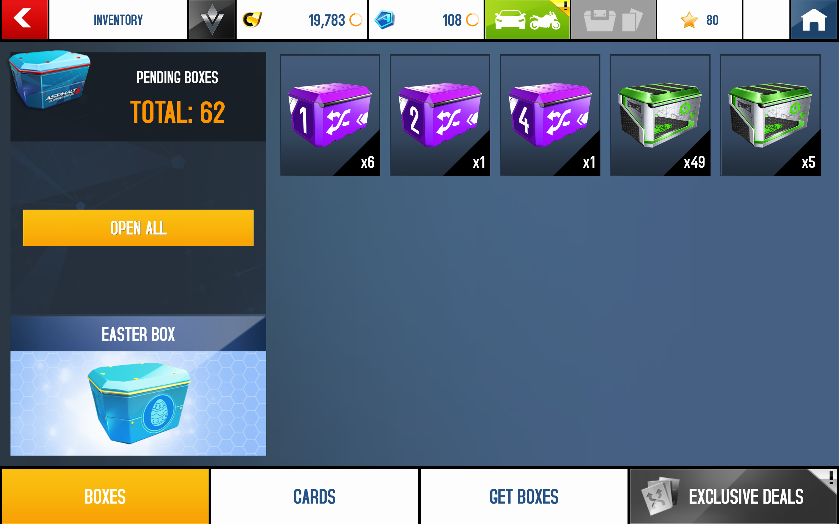 - The inventory now has a separate tab for boxes, gives the option to open them all at once, and filters Pro cards and Blueprints.