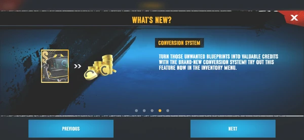 - Introduction of the Conversion System which allows unwanted blueprints to be sold for credits.