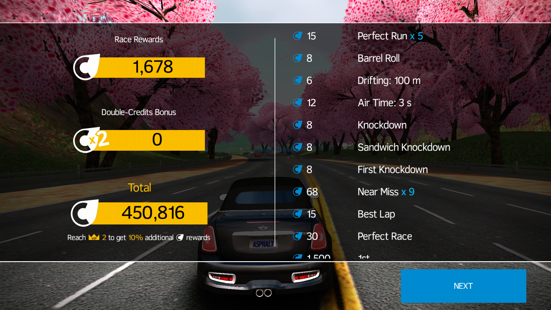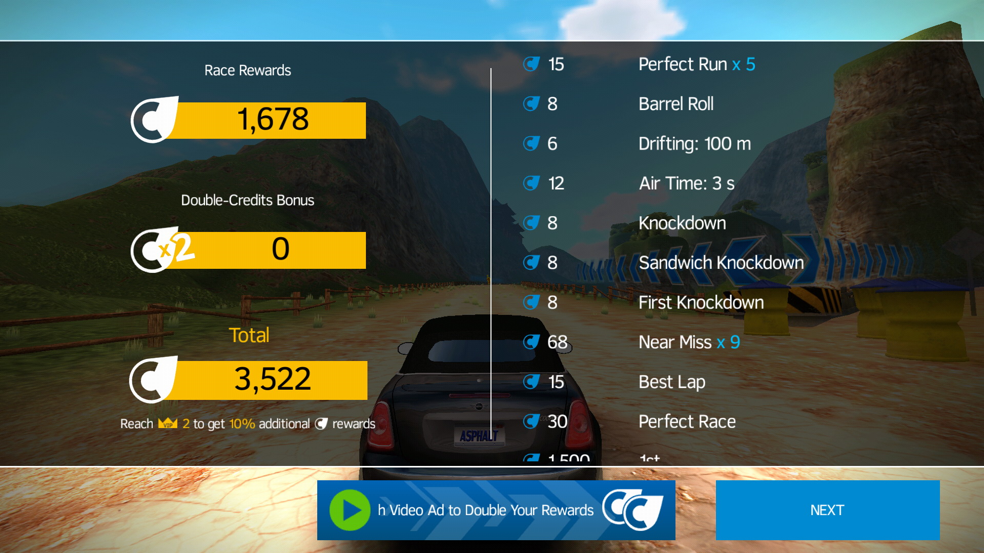 After a race, players are given an option to watch an ad in order to double their earned Credits. There are two important differences to the former Double Credits option in Asphalt 8: