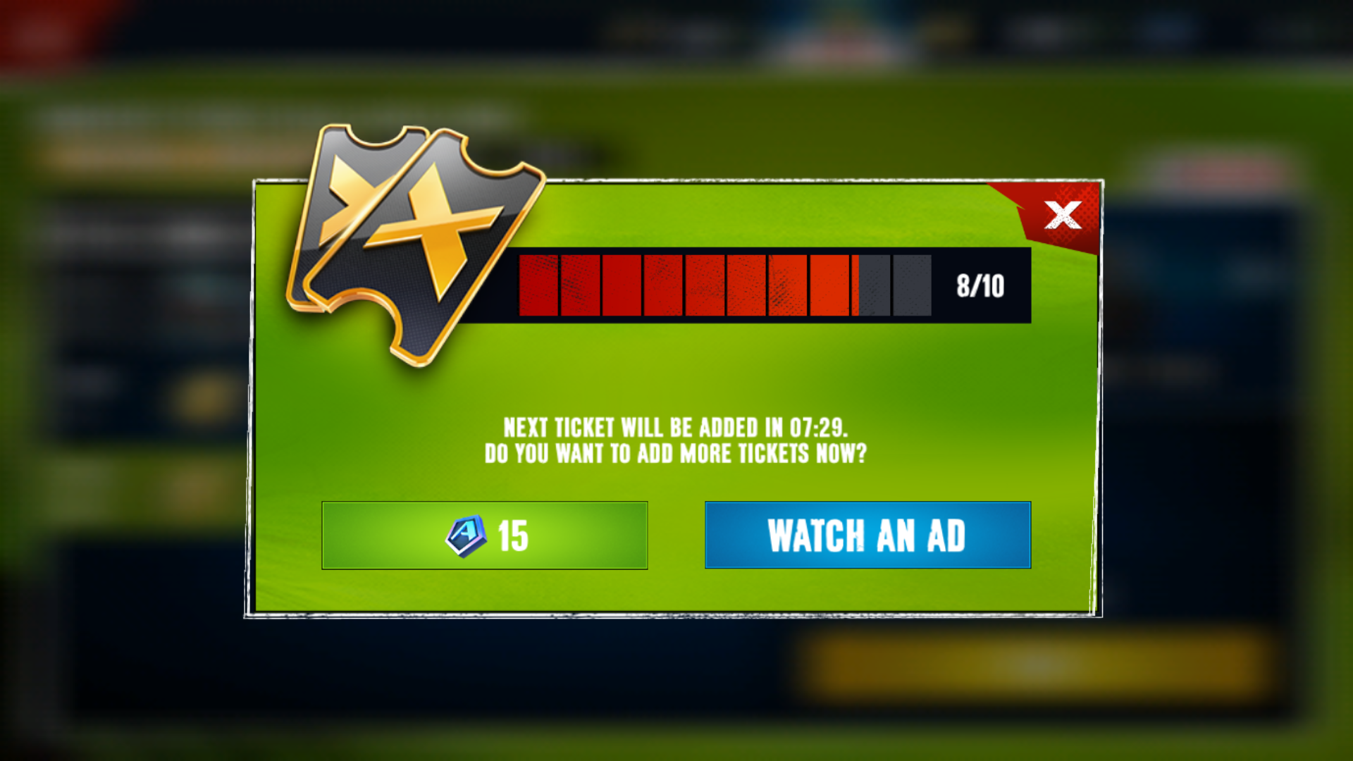 Players can watch ads to gain tickets to continue racing in TLE's or Special Event races if they have partially or completely used all their tickets. A player can watch up to a total of 10 ads to gain tickets per day.