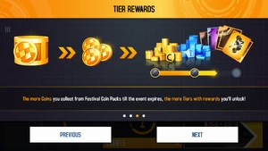 Coins are contained in Festival Coin Packs. They are obtainable from the quests, a daily free Coin button (once per day), through the Festival TLEs or from purchasing Festival bundles. Purchasing the Festival Pass with an in-app purchase grants additional rewards when a new tier is reached. If the Improved Festival Pass is purchased, all Premium rewards in completed tiers will be awarded.