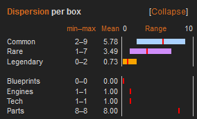- If there is no bar at all around the red lines, there are no deviations. Minimum, maximum and mean values are identical, which indicates that the number of cards is not random, but fixed. This is the case for the amounts of Blueprints, Engines, Tech and Parts: Every single Daily Kit Box grants exactly 0 Blueprints, 1 Engine, 1 Tech and 8 Part cards.