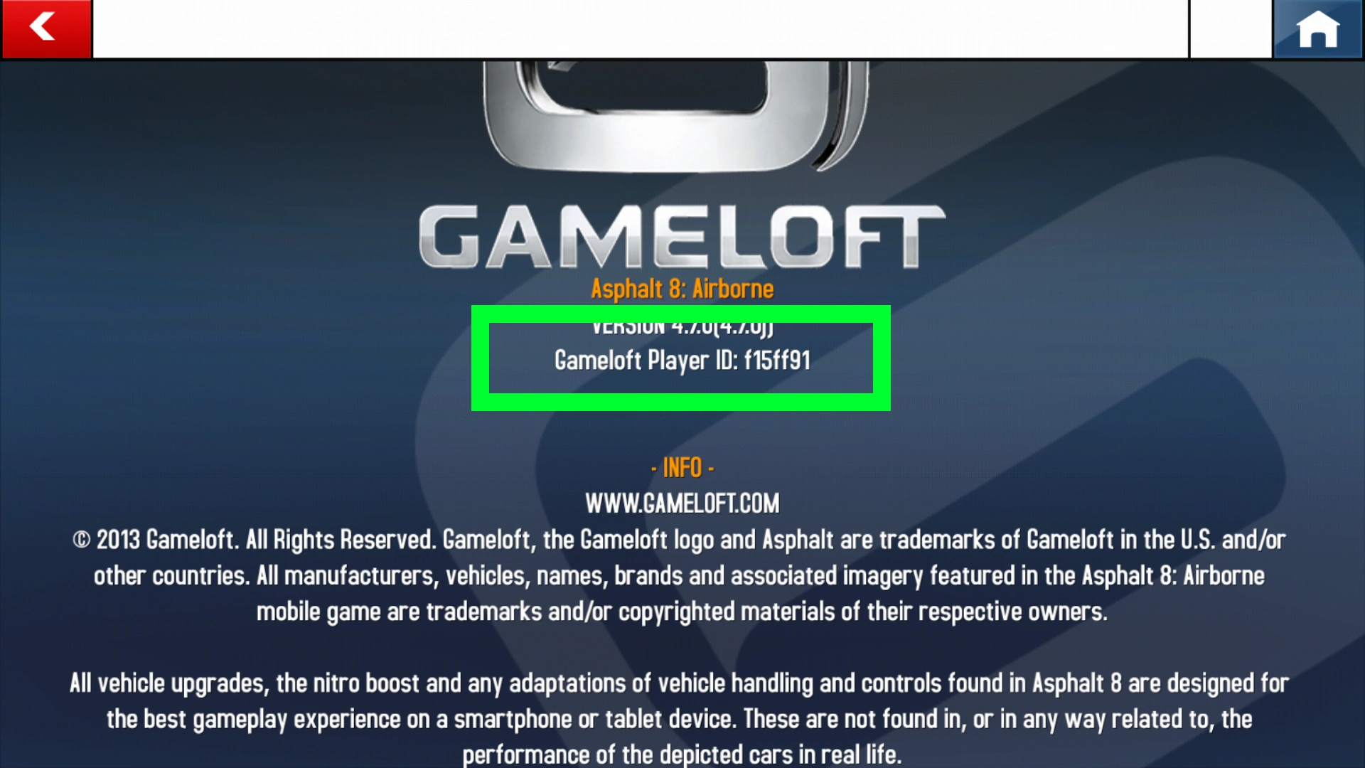 Your Gameloft Player ID and platform (Android, iOS, Windows) are needed by Gameloft to send the rewards to your account. You can find your Gameloft Player ID in Settings | Info | About, see screenshot to the right. Please post your ID and platform on Guy Bukzi Montag's Message Wall or send it via Discord (username on profile page). Gameloft will only get a list of Player IDs, not your Asphalt Wiki username.