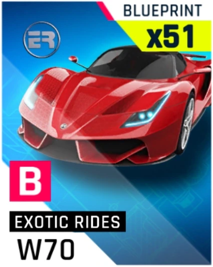 Introduced in the Car Blueprints Update and actively used until the Hot Wheels Update, after which most new vehicles reverted back to the old system of being obtainable only via completing its event, a maximum of 3 blueprints are purchasable at any time from Exclusive Deals or obtained randomly from Pro Boxes.