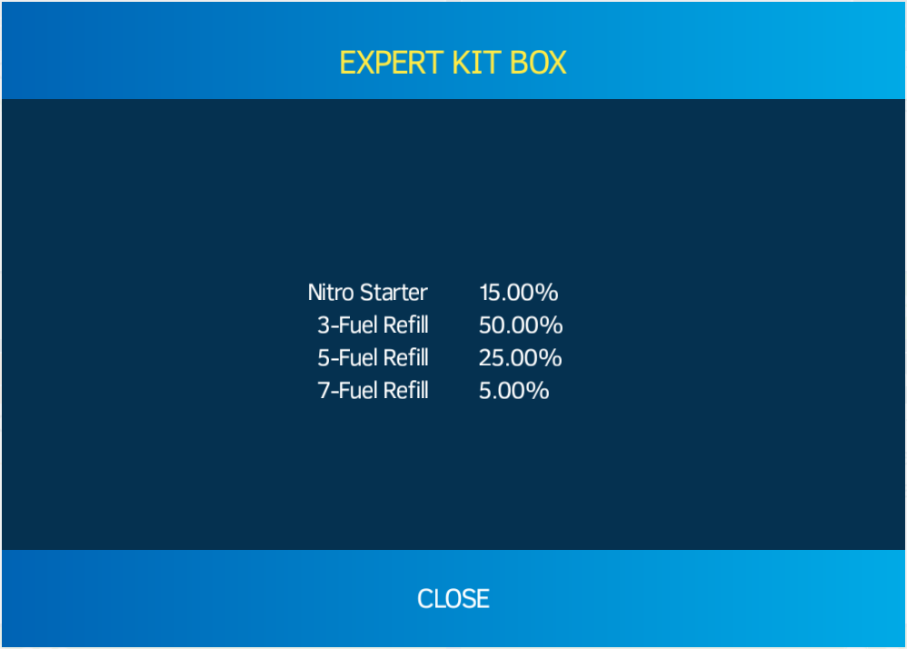 The box info (unofficial term) is a gameplay element first introduced in Asphalt 8: Airborne with the Fall Out Boy Update. It shows the drop rates of a Pro Kit Box when a player taps on its info icon (