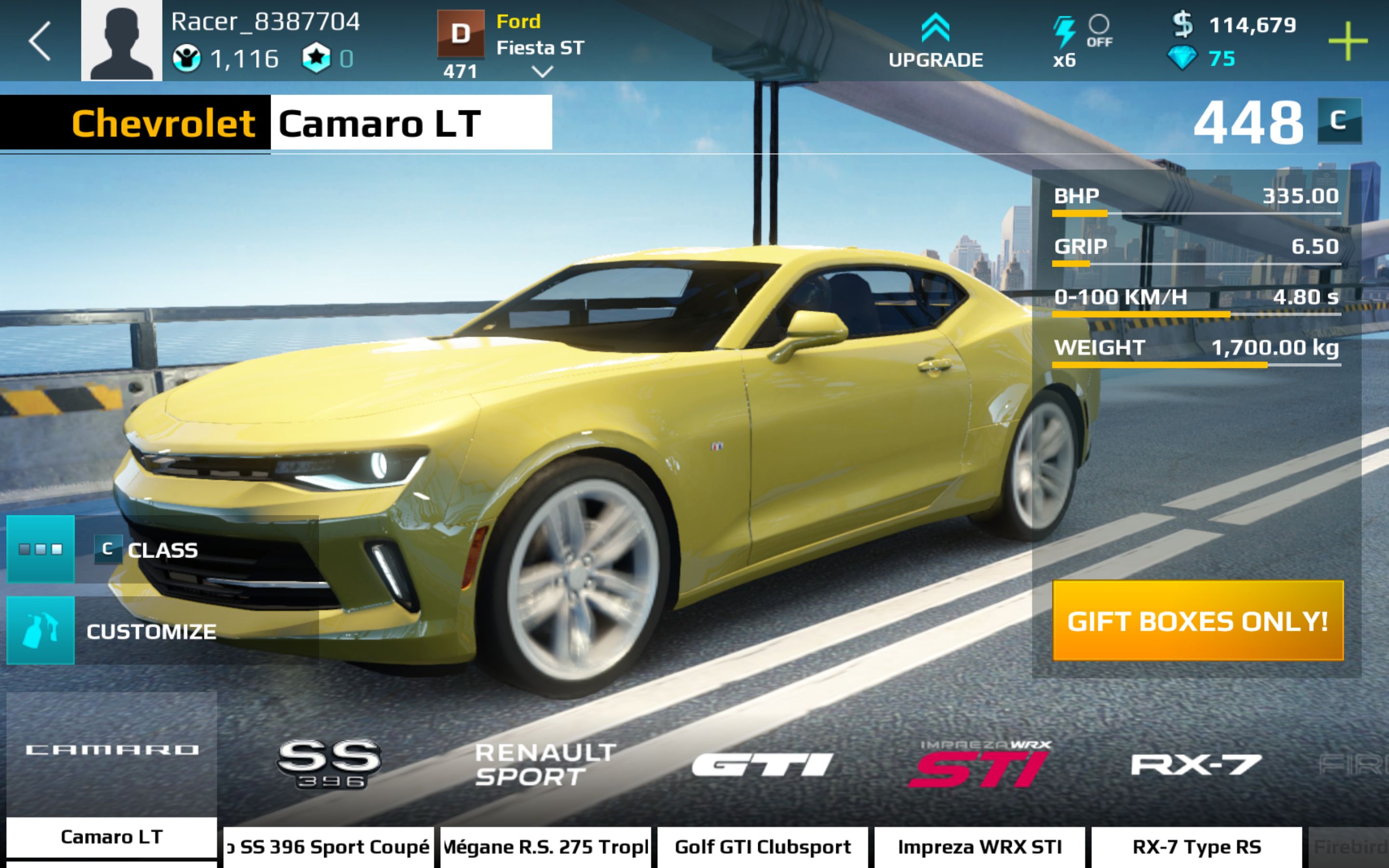 The Chevrolet Camaro LT appears as a Class C car. Its blueprint is unavailable since the game development has been stopped. The only way to obtain the car would be winning it from another player in a Pink Slip.