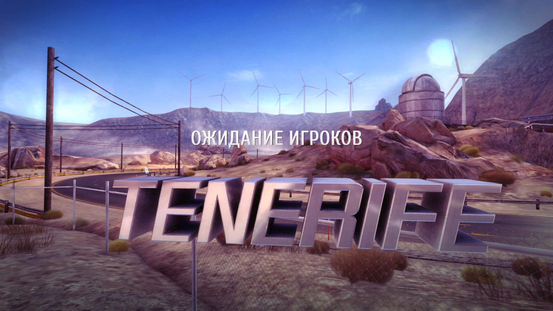 The Russian equivalent of "Waiting for other players" ("Ожидание игроков") written in Cuprum Bold, alongside the track name in (Latin) Monkirta Pursuit. Track names are rendered as 3D objects, not as text; this is the reason why they are never translated.