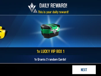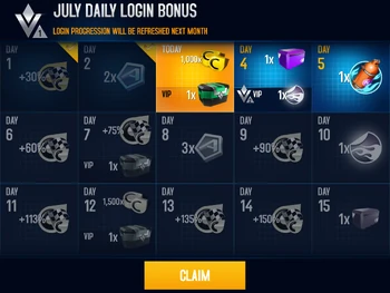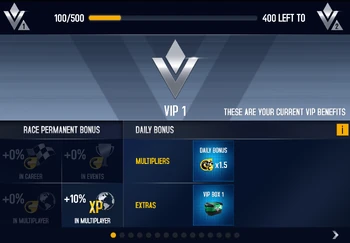 The Daily Bonus system was overhauled in the Rio de Janeiro Update, with the introduction of the VIP System. The Daily Bonus is dependent on a schedule, which is fixed in advance and the user's VIP Level. It offers a variety of bonuses such as Credit Bonus Multiplier on the next race, fixed amount of Credits, Tokens, a Pro Box, booster, or decal. As of the Multiplayer League Update, Season Tickets are awarded as daily rewards as well.