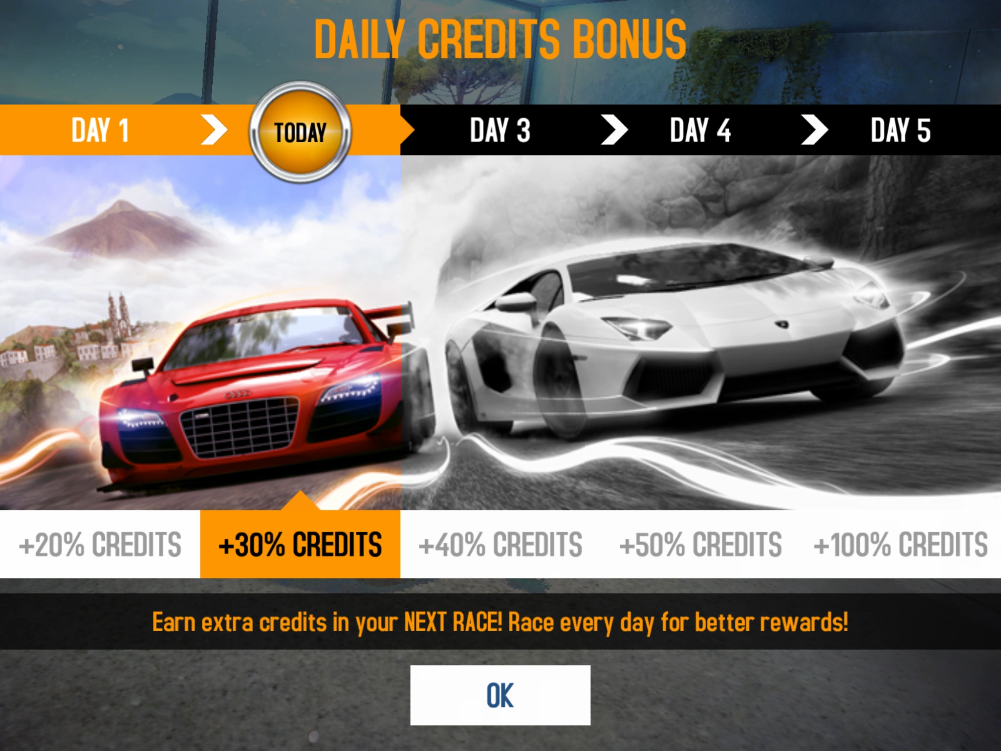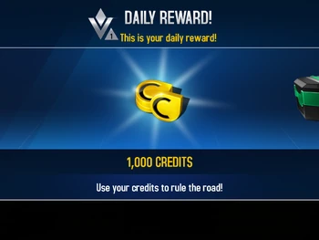 The percent bonus you received depended on how many consecutive days the player had connected in the game. The highest possible reward was a 100% bonus on the 5th day, thereby doubling the amount of earned Credits, similar to the Double Credits item. Subsequent logins after the 5th day would always award a 100% bonus. In fact, if a 100% Daily Bonus was used in conjunction with the Double Credits item, it was possible to quadruple the amount of credits that the player would normally earn in a race. This allowed a user to earn up to