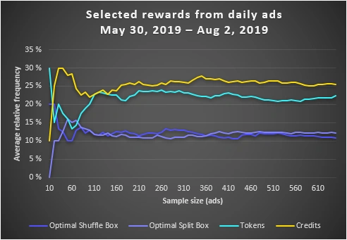 Although the sample has reached an acceptable size of 200 ads, the average frequencies are not yet stable because of several events with high deviations. For example, it has been observed that the amount of Token rewards can vary from 0 to 50 % of a day's rewards. This also greatly influences the percentages of the other rewards and leads to the graphs taking longer to approach a straight line.