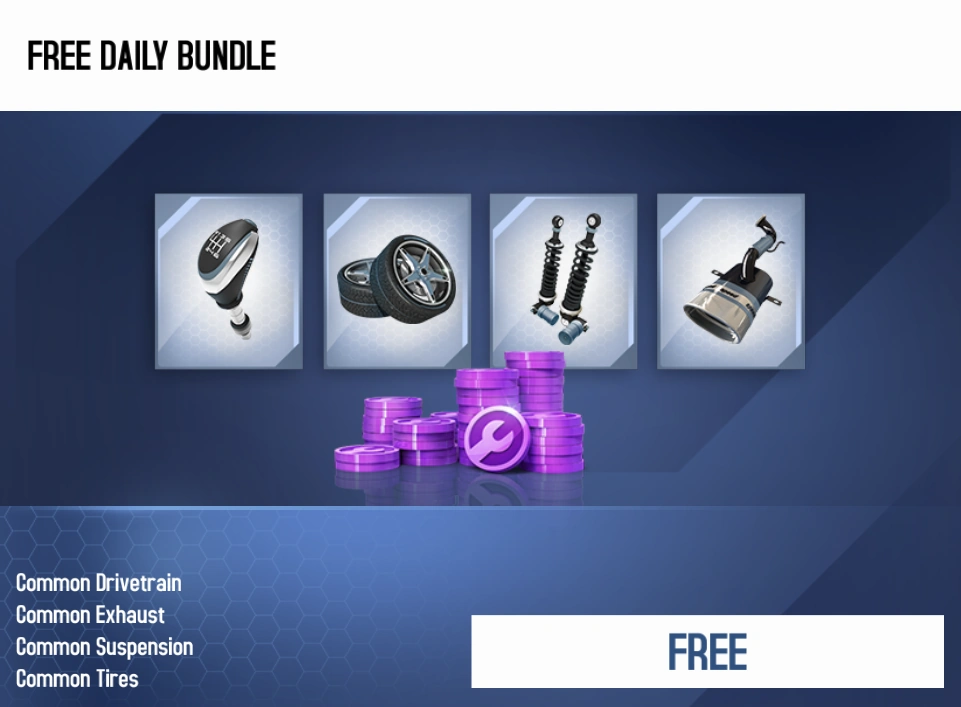 The Free Daily Bundle is a Bundle in Asphalt 8: Airborne introduced with the 2020 Lunar New Year Update. The Fifteenth Anniversary Update replaced the previously contained Pro Kit Boxes with