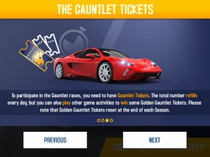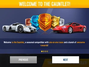 Gauntlet is a competitive multiplayer race mode in Asphalt 8: Airborne, added in the 2020 Halloween Update. It combines elements of several older game modes, including Rivals of Asphalt Nitro, Asphalt Tracker (Ghost racing), Tag Racing, Multiplayer League and Time-Limited Events. Players compete in week-long seasons in order to win prizes.