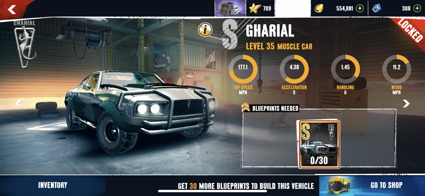 The Gharial was added on July 15, 2020, as part of a soft update to the 2019 Winter Update. It is a Class-S Muscle Car with a starting level of 35 and needs 30 of its blueprints to be built. Oil changes cost