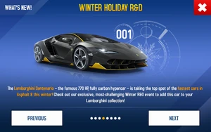 The Lamborghini Centenario -- the famous 770 HP, fully carbon hypercar -- is speeding into Asphalt 8 this winter! Check out our exclusive Winter R&D Event to add this car to your Lamborghini collection!