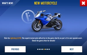 Ride the Lightning LS-218. This superb motorcycle will arrive in the game with its own special event shortly. Check the game often for details!