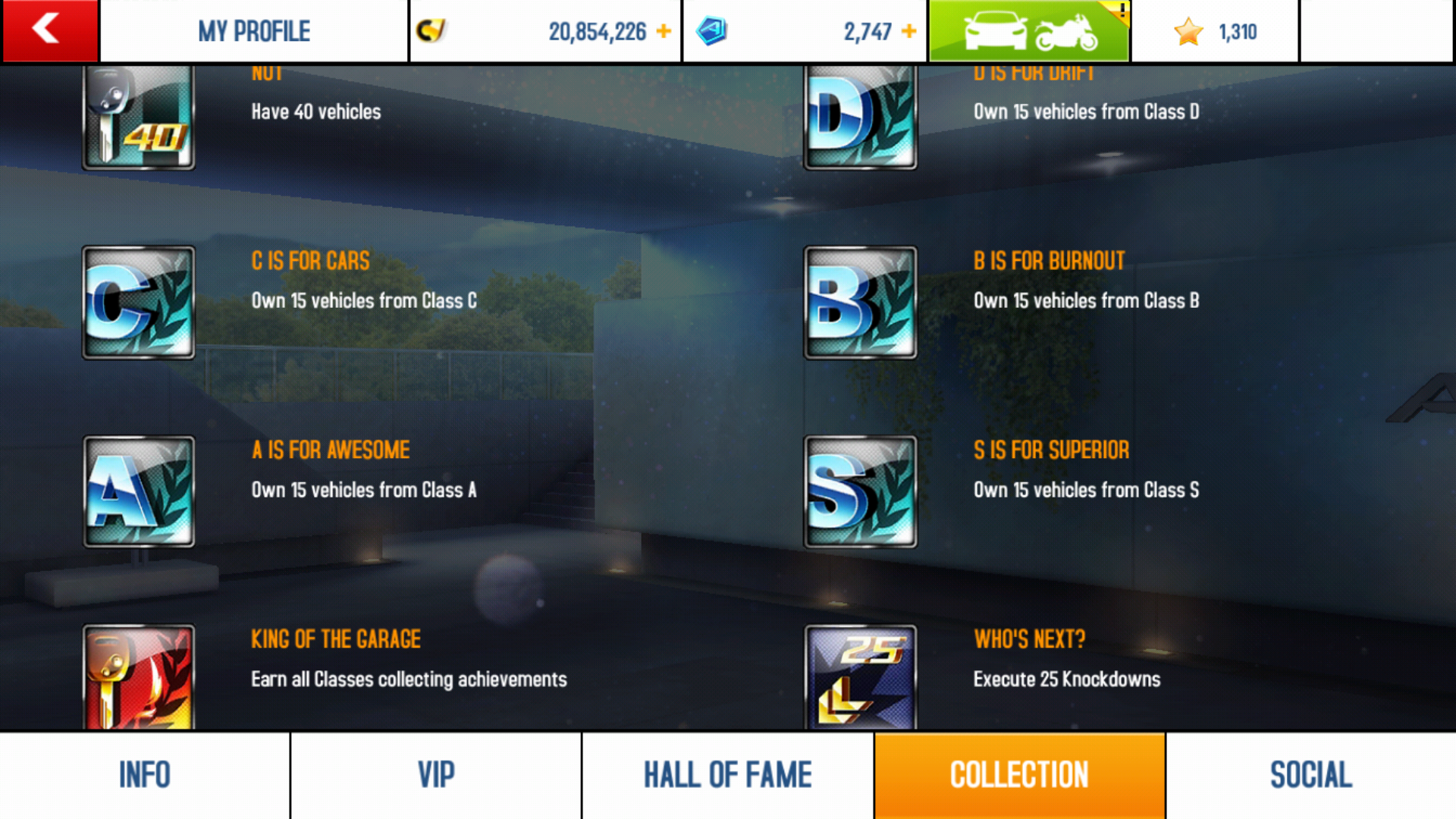 - The achievements D is for Drift, C is for Cars, B is for Burnout, A is for Awesome, S is for Superior, and King of the Garage can now be achieved by owning any 15 vehicles per class rather than by owning the original vehicles.