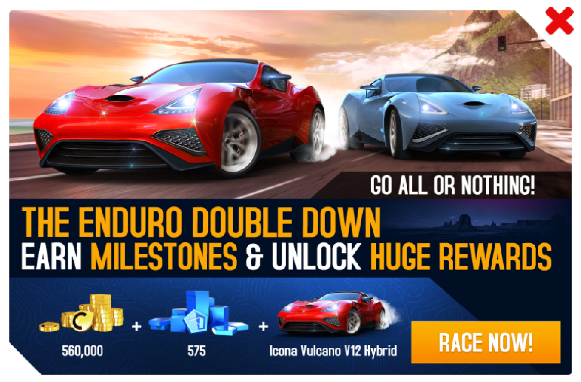 The Icona Vulcano V12 Hybrid is the fourth Enduro Double Down-unlockable car and was released as part of the Multiplayer League Update. Players are given 8 days to complete the event.