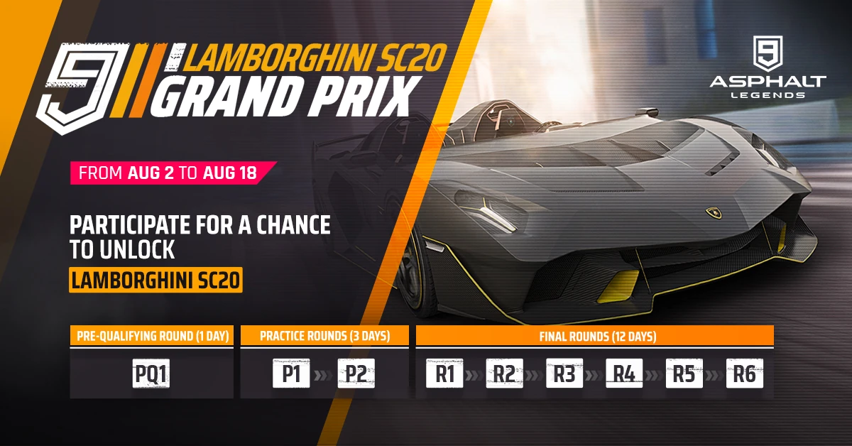 The Lamborghini SC20 Grand Prix was released as the 19th Grand Prix event as part of the Heatwave Season Update. It was available between August 2 - August 18, 2021. Players are given 1 day per Qualifier, and 2 days per Final Round spanning 6 Rounds.
