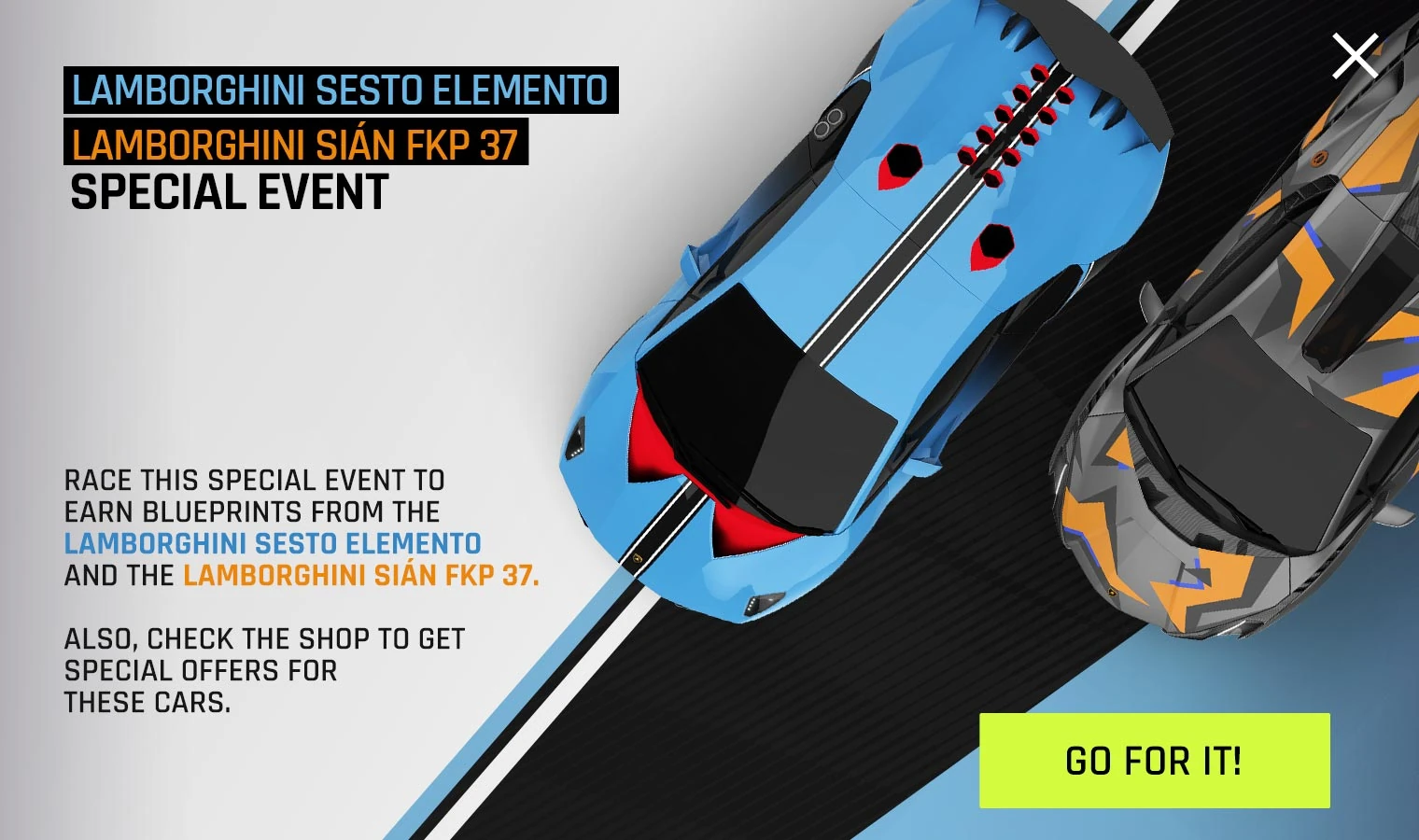 The Lamborghini Sesto Elemento Special Event was released as the 38th Special Event. It was avaliable between June 2, and 23, 2022. The event had 11 stages with a time limit of 24 days once the event had started.