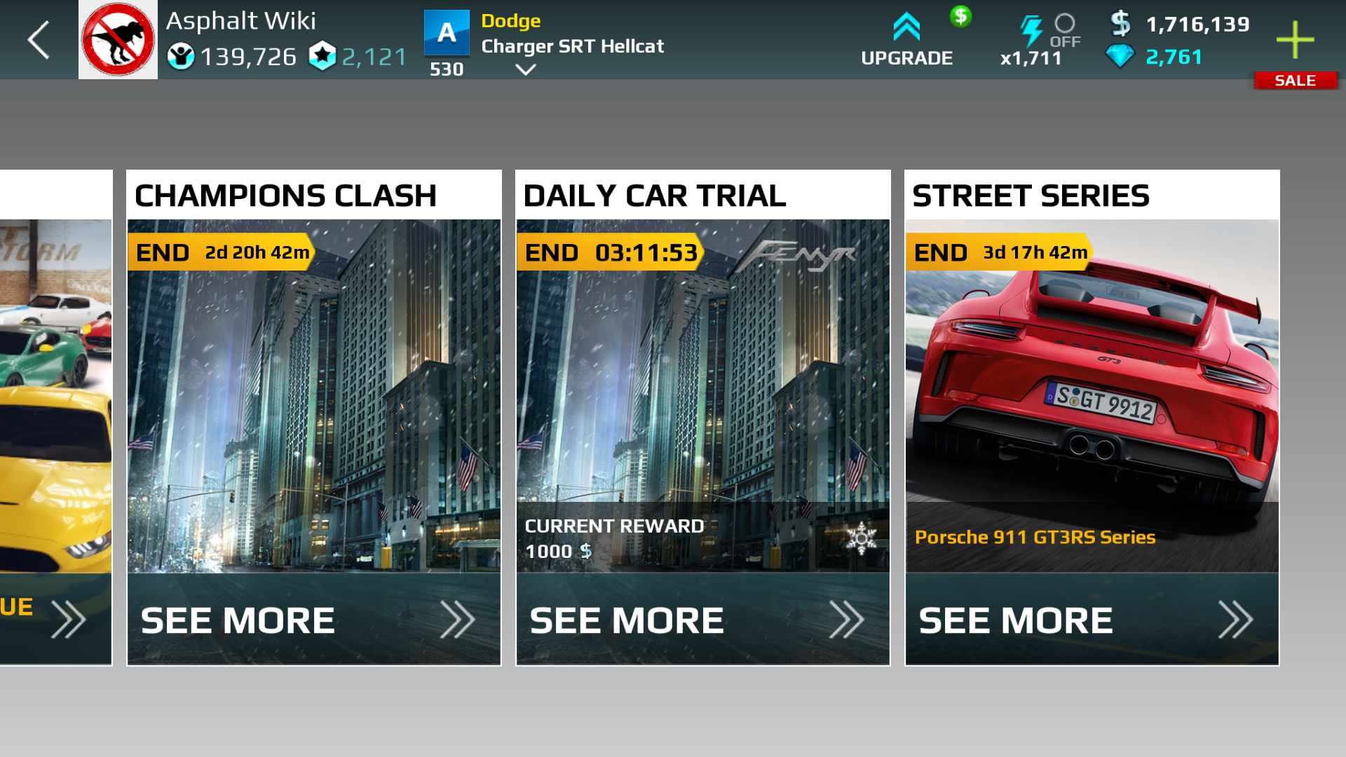 Right part of the Race screen which leads to the Champions Clash, Daily Car Trial and Street Series screens.
