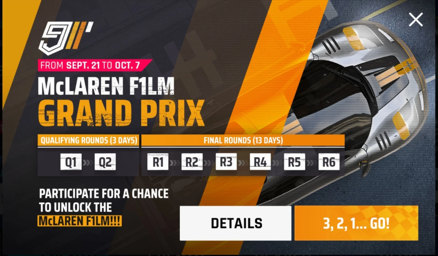 The McLaren F1LM Grand Prix was released as the 10th Grand Prix event as part of the British Season Update. It was available between September 21 , 2020 and October 7, 2020. The event features a Qualification and Finals round with a time limit of 1 day per Qualifier, and 2 days per Final Round.