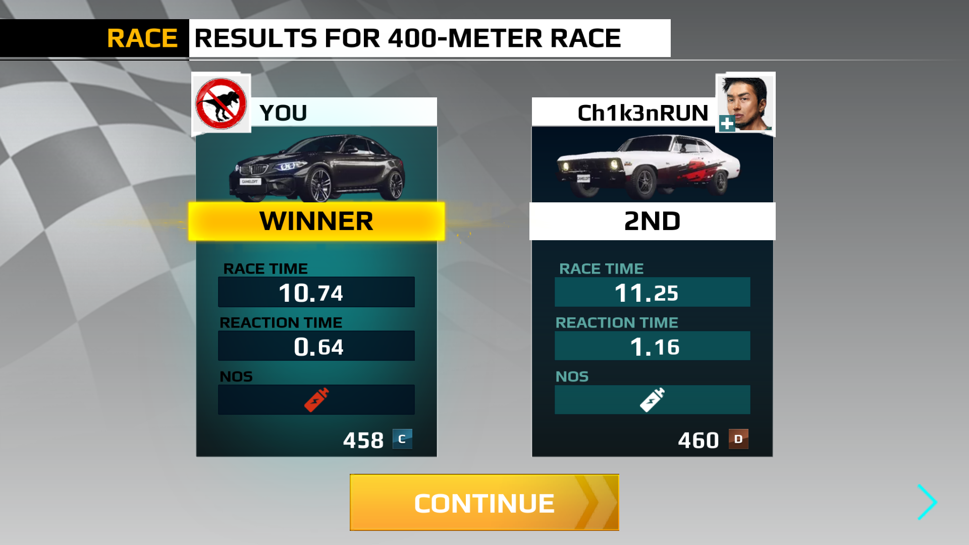Race results screen: Although the player's car has NOS equipped, the bottle appears red because it was not activated. The opponent did activate it, therefore the bottle is white.
