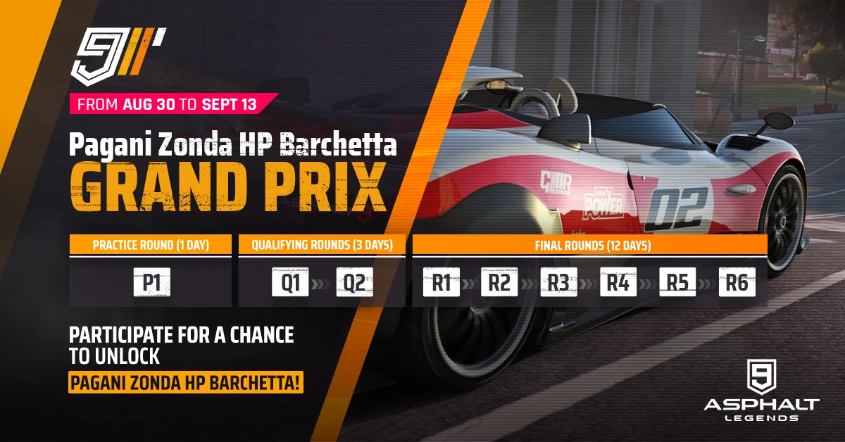 The Pagani Zonda HP Barchetta Grand Prix was released as the 20th Grand Prix event as part of the Heatwave Season Update. It was available between August 30 - September 13, 2021. Players are given 1 day per Qualifier, and 2 days per Final Round spanning 6 Rounds.