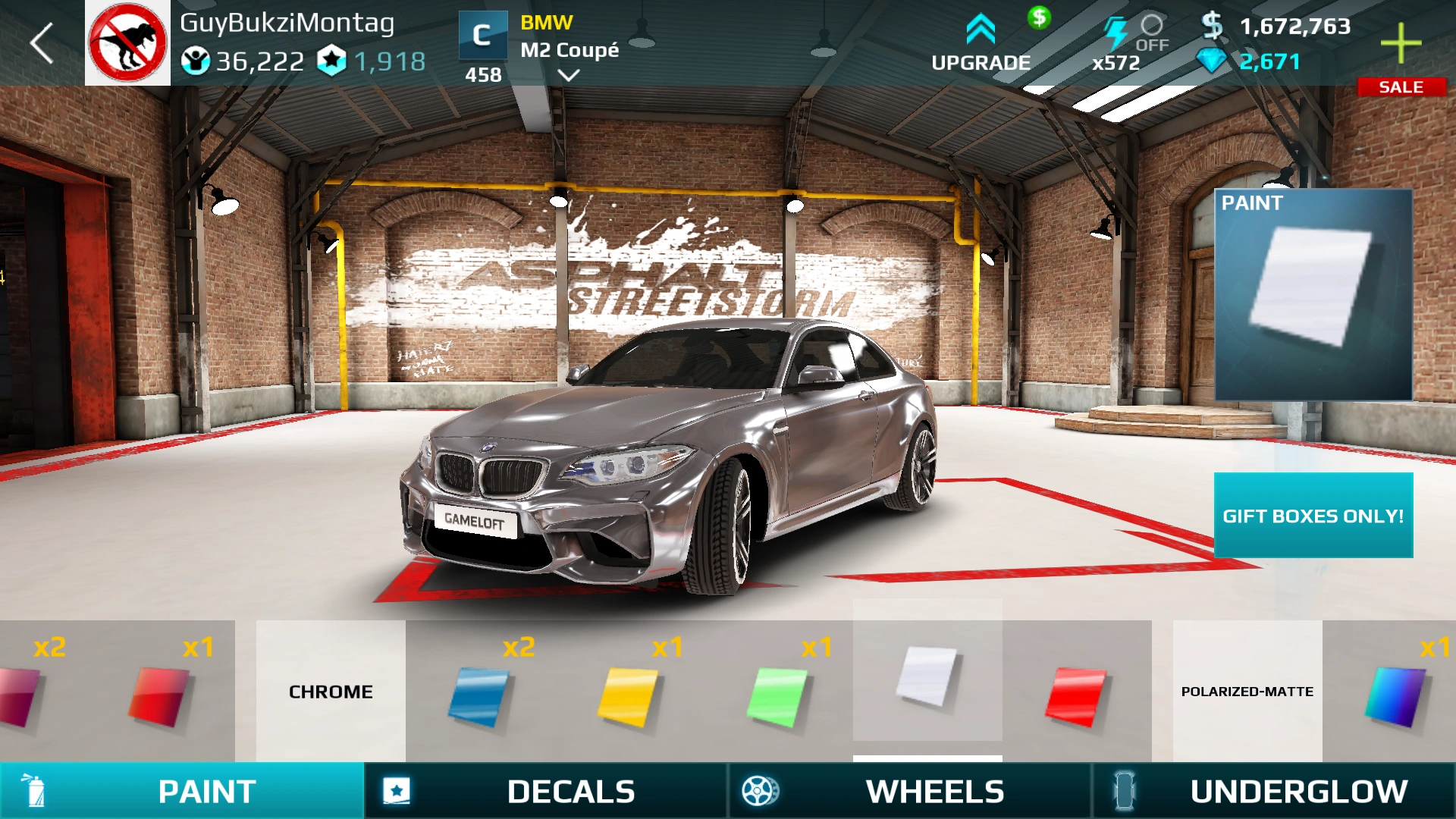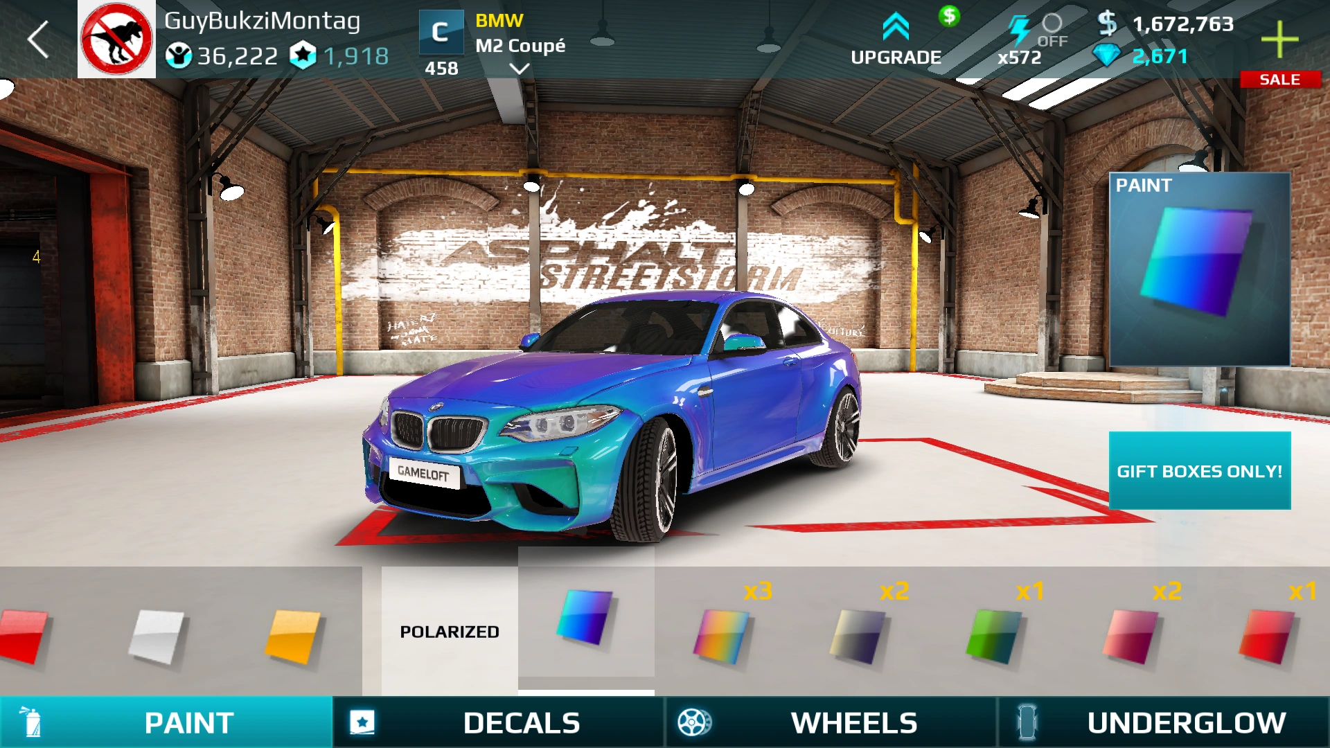 Unlike in Asphalt 8: Airborne, customization is more similar to real life: Changing a color always costs Cash. Also, once a paint from Gift Boxes is applied, it disappears from the inventory and must be acquired again if another paint has been applied afterwards or if the player wants to use it for another vehicle.