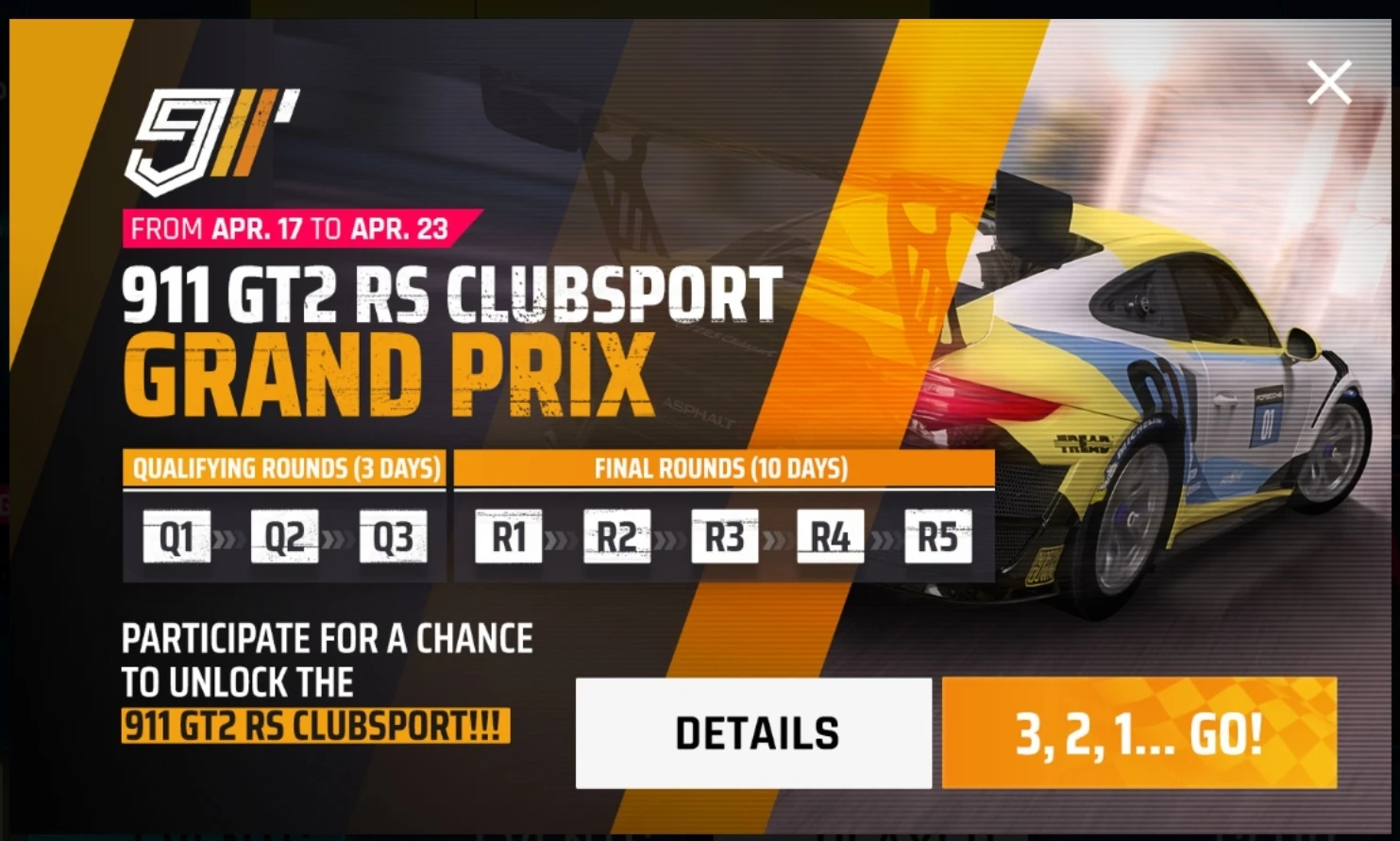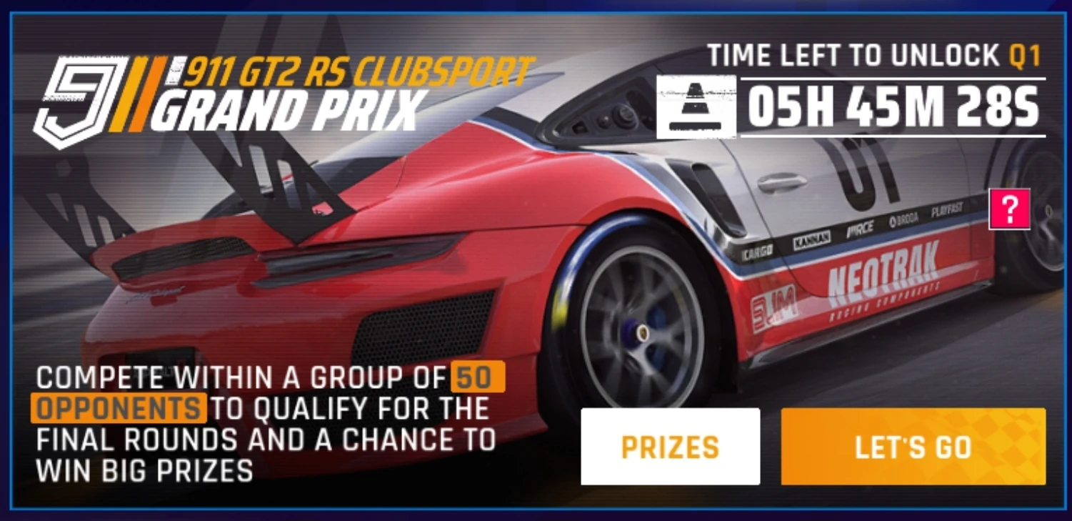 The Porsche 911 GT2 RS Clubsport Grand Prix was released as the 3rd Grand Prix event as part of the Porsche Season Update. It was available between April 17, 2020 and May 4, 2020. The event features a Qualification and Final round with a time limit of 1 day per qualifier, and 2 days per each stage.