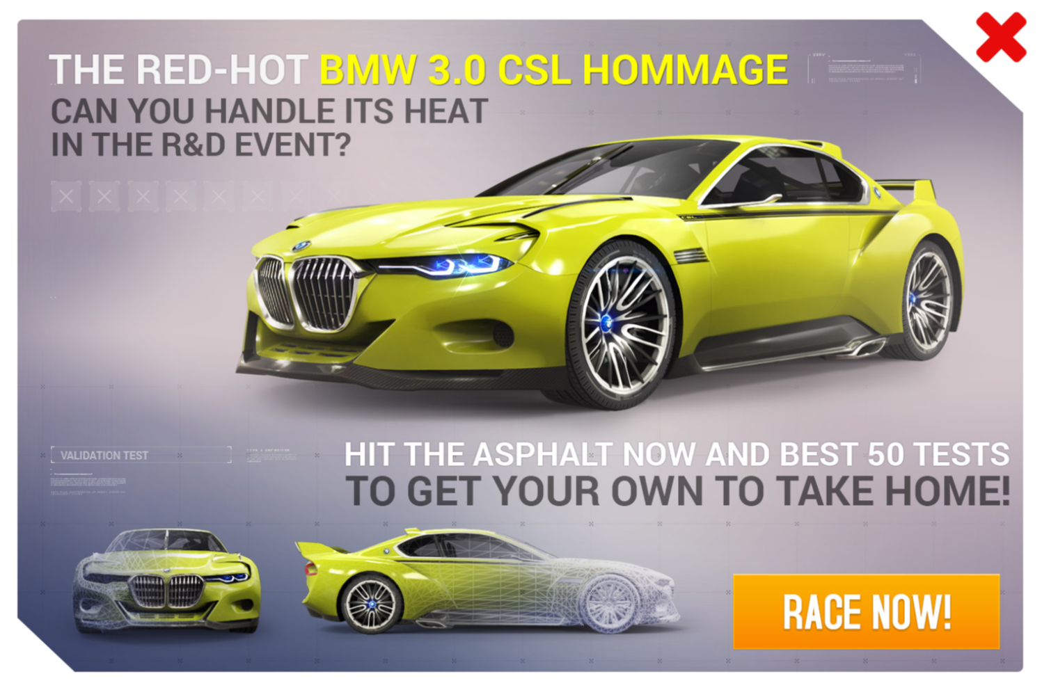 | R&D Advanced Kit Box (Type 1) "Grants 6 cards for the R&D BMW 3.0 CSL Hommage!" Rewarded for test: 16, 31 Observed: