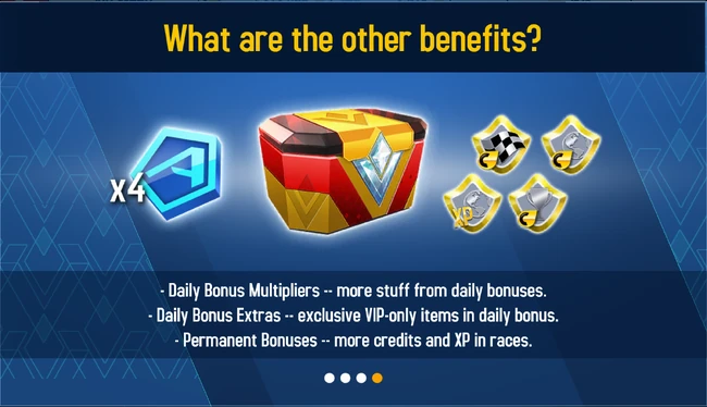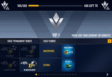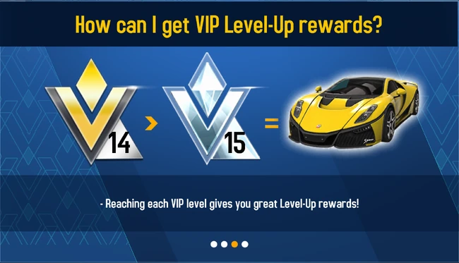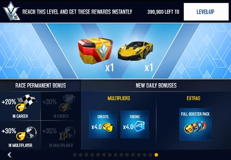 Going from 0 to 15, every level has its specific benefits. When a new level is reached, the rewards for the new level is given immediately and can include Tokens, Credits, multipliers, Kit Boxes, Boosters, and cars. The current level determines the Race Permanent Bonus which is active in all races an all game modes, as well as the Daily Bonus. Other rewards were the Volkswagen Beetle Turbo, Range Rover Evoque Coupe HSE Dynamic, Ferrari Testarossa, and the McLaren 570S. The car rewards were changed in the 2021 Spring Update to only contain the Ariel Atom V8 at VIP level 1.