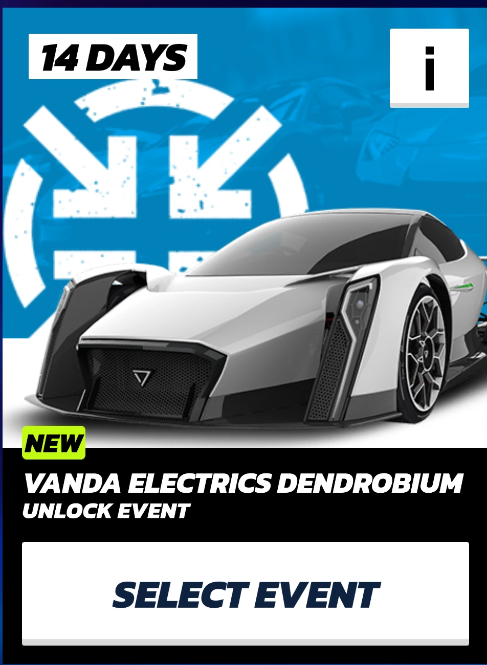 The Vanda Electrics Dendrobium (Showroom) is a Showroom event added in the Asphalt Legends Unite Expansion Update of Asphalt Legends Unite . This event has 16 stages with a time limit of 14 days once started.