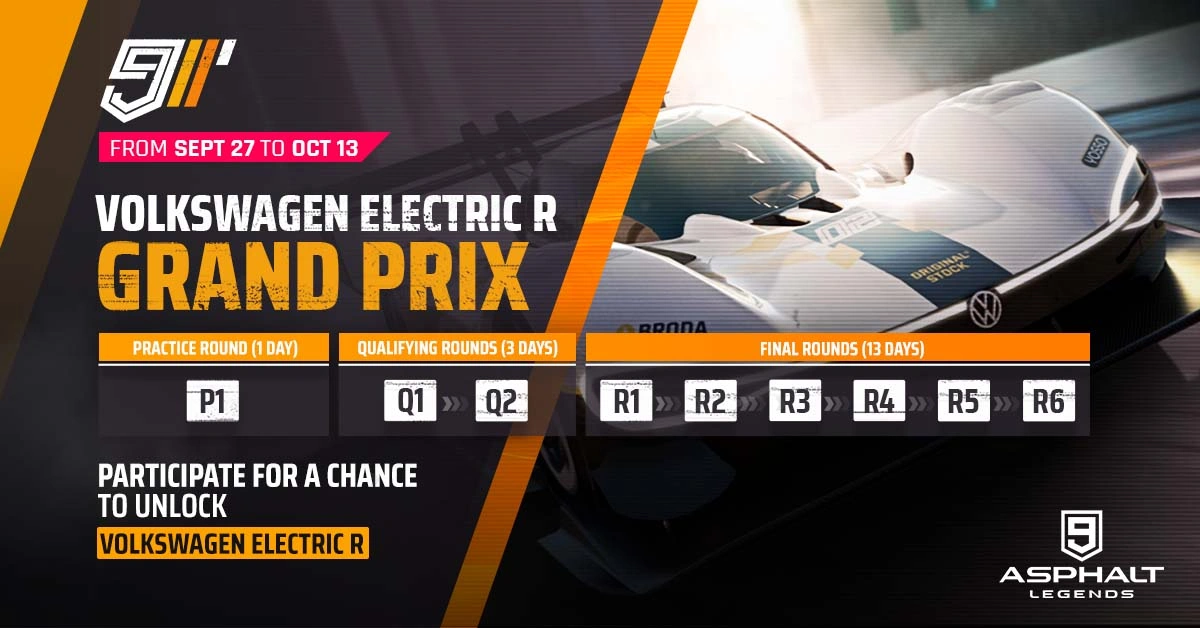 The Volkswagen Electric R Grand Prix was released as the 21st Grand Prix event as part of the Electric Season Update. It was available between September 27 - October 13, 2021. Players are given 1 day per Qualifier, and 2 days per Final Round spanning 6 Rounds.