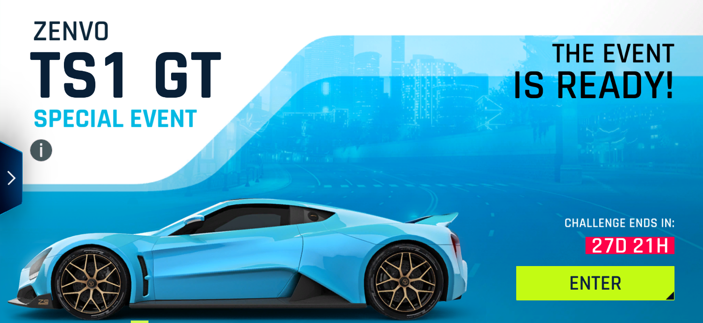 The Zenvo TS1 GT Anniversary Special Event was released as the 7th Special Event as part of the Tune It Up Update and is the second event in the King Of The Fall Event series. It was available between October 4, 2019 and November 1, 2019. The event had 24 stages with a time limit of 28 days once the event had started.